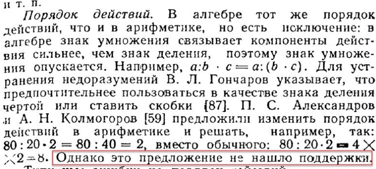 Я как человек дотошный сходил по ссылкам и пришёл в изумление. Действительно, Александров и Колмогоров предложили считать умножение имеющим высший приоритет чем деление