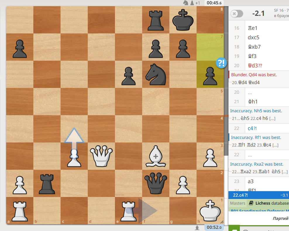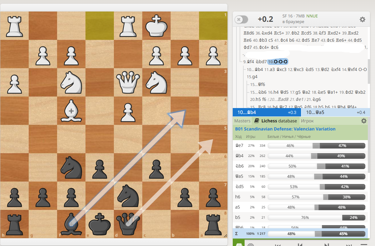 Во-вторых, есть чисто практическая закономерность: если соперник играет чехню, но вы почему-то отступаете, то одно из двух: либо отступать вы вовсе не обязаны, и надо поискать альтернативы, либо он играет не чехню) В данном случае явно первый вариант.