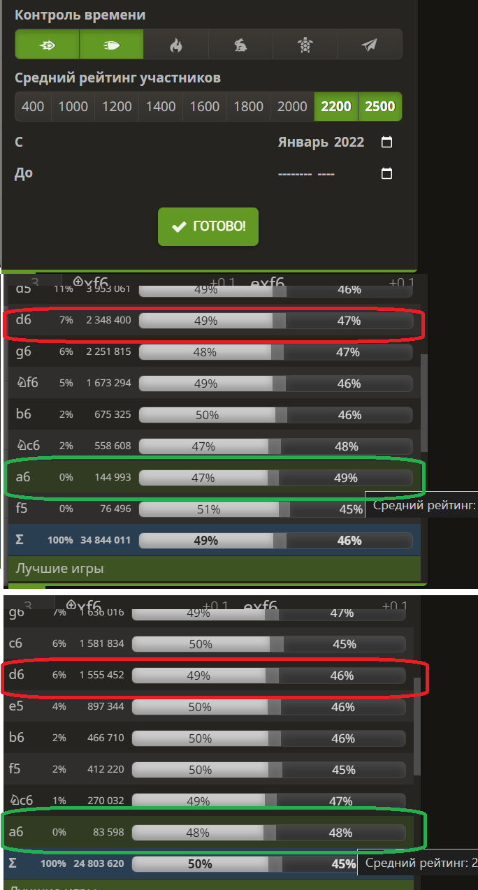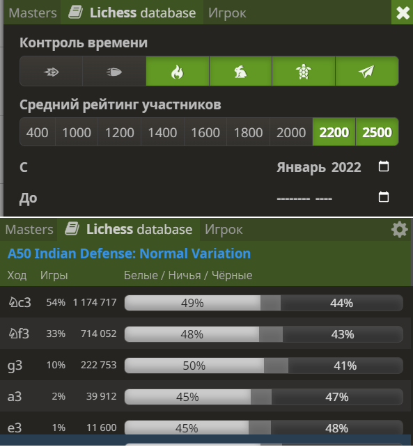 Сверху статистика после 1.e4 и снизу против 1.d4