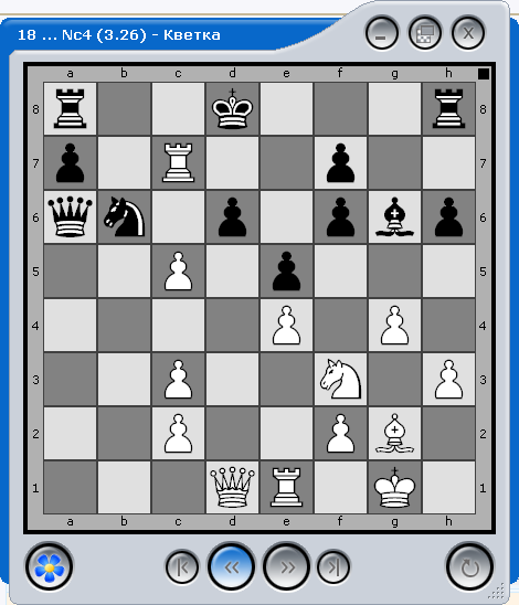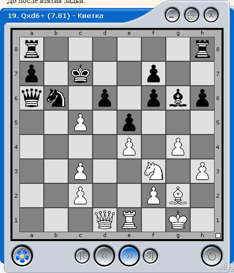 Партия любопытна тем что белые жертвуют за темпы целую ладью, причем в закрытой позиции! И начиная с этого момента комп ни разу не показывает за черных какого-либо перевеса, оценка всегда в пользу белых.