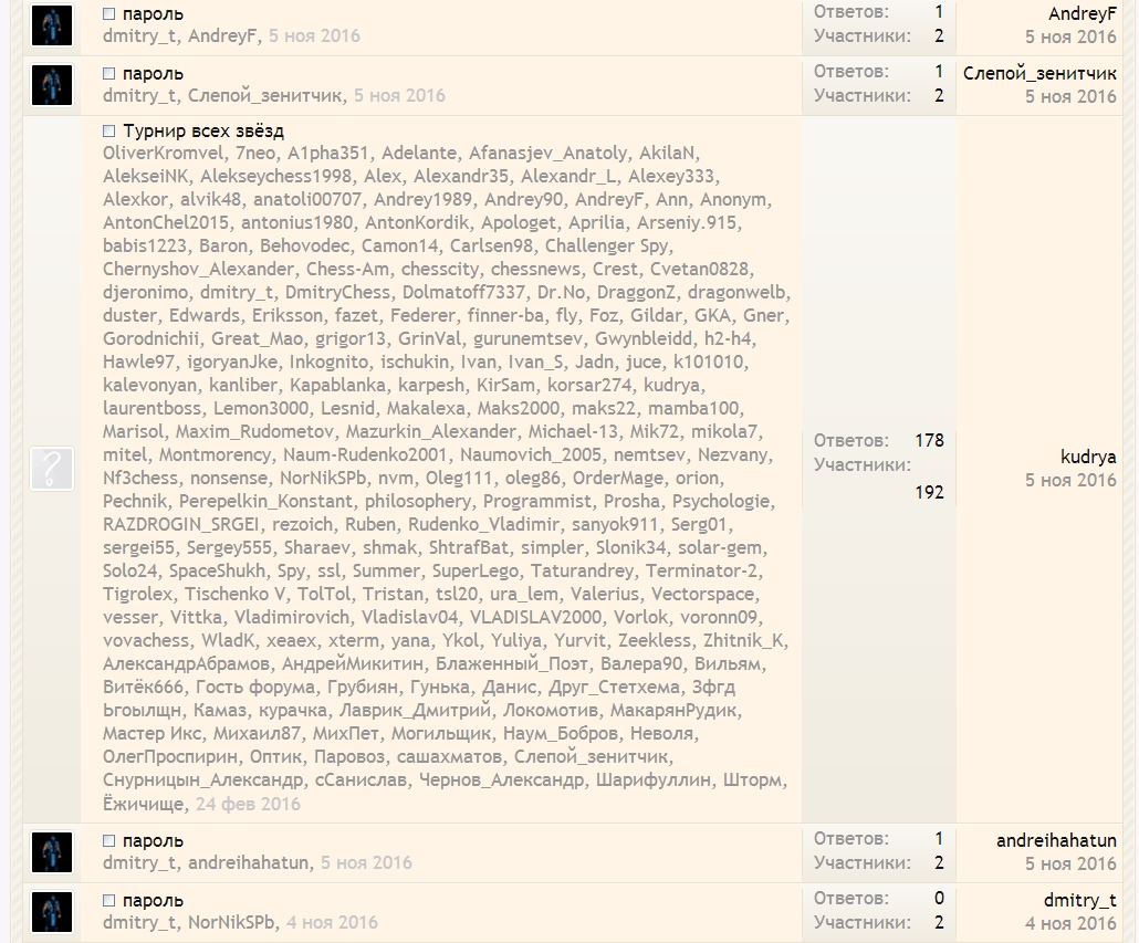 Пароли на все наши турниры выдаются в закрытой от посторонних переписке, куда я добавляю людей, когда они называют свой никнейм на Шахматной Планете.