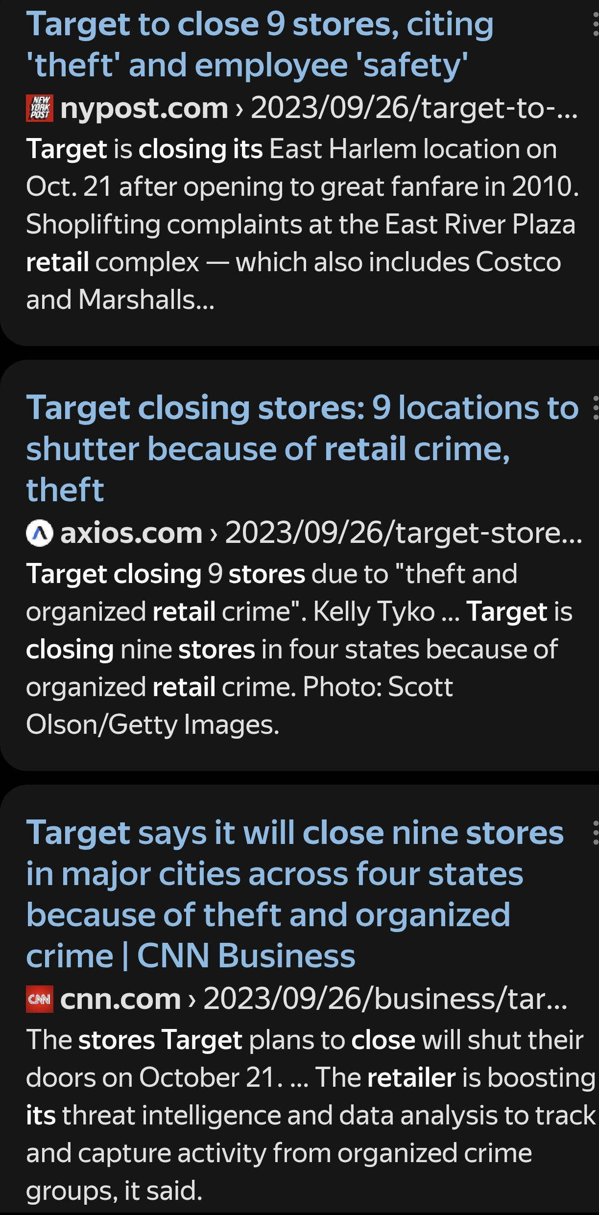 Да, действительно, магазины Target собирались закрыть ( ссылаюсь на статью 2023 года ). Я не знаю, сейчас в 2025 году закрыли их или нет. Но воровство в магазинах - глобальная проблема.